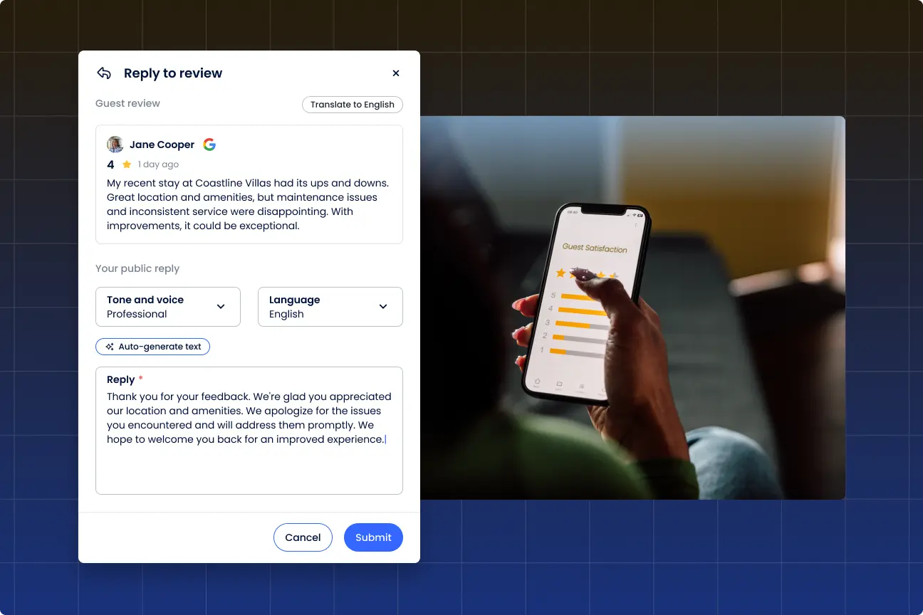 Easily respond to reviews across Google, Booking, and Airbnb with automated responses.