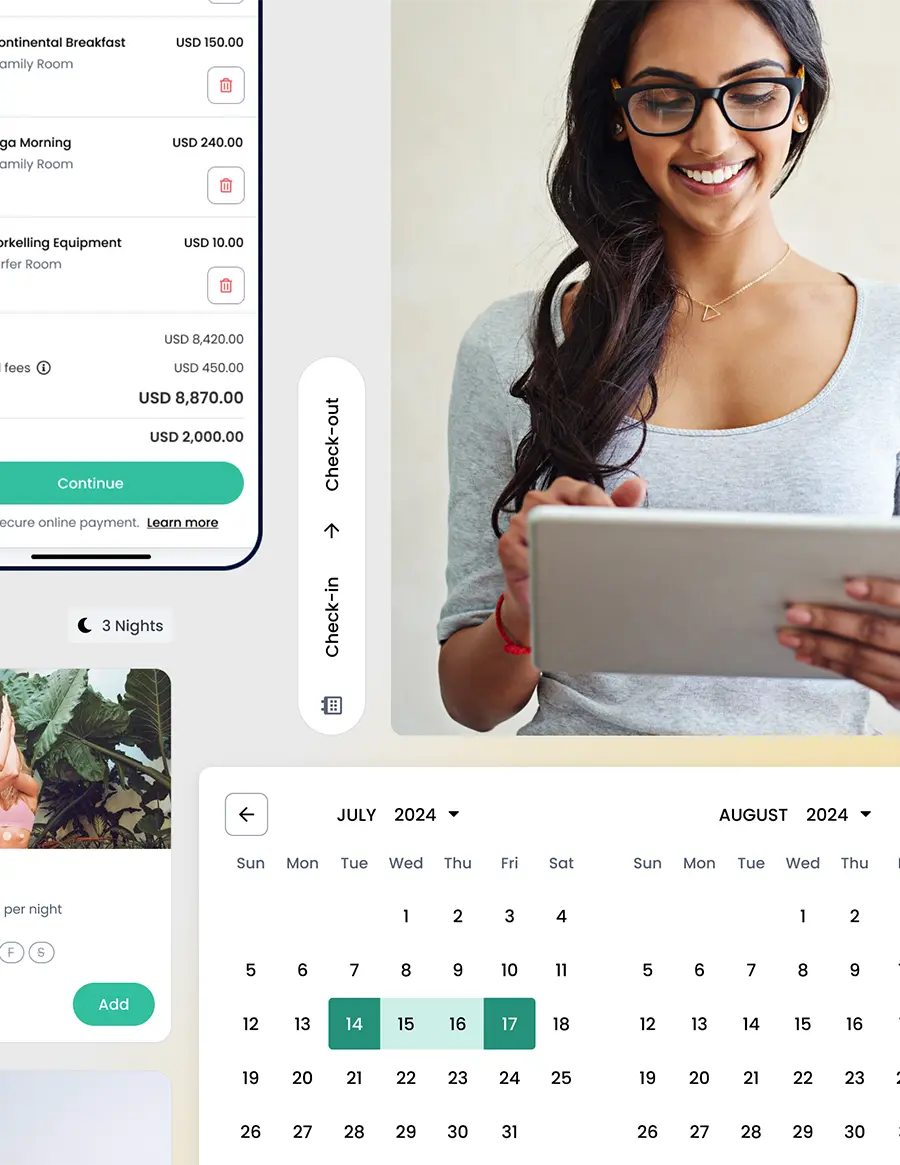 A modern booking engine offers guests real-time availability, secure payment processing, and instant confirmations, facilitating a seamless online shopping experience. You can configure it to fit your brand, cater to international audiences with multi-language and currency options, and offer add-ons or upsells to help you increase your bottom line.