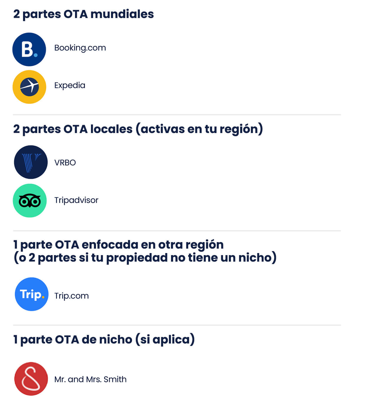 Para aumentar la visibilidad ante los huéspedes potenciales, los propietarios deben estar conectados a 6 OTA, incorporando 2 OTA globales, 2 OTA locales (activas en tu región), 1 OTA de la región objetivo (dirigida a viajeros de un mercado regional diferente) y 1 OTA especializada (si aplica).