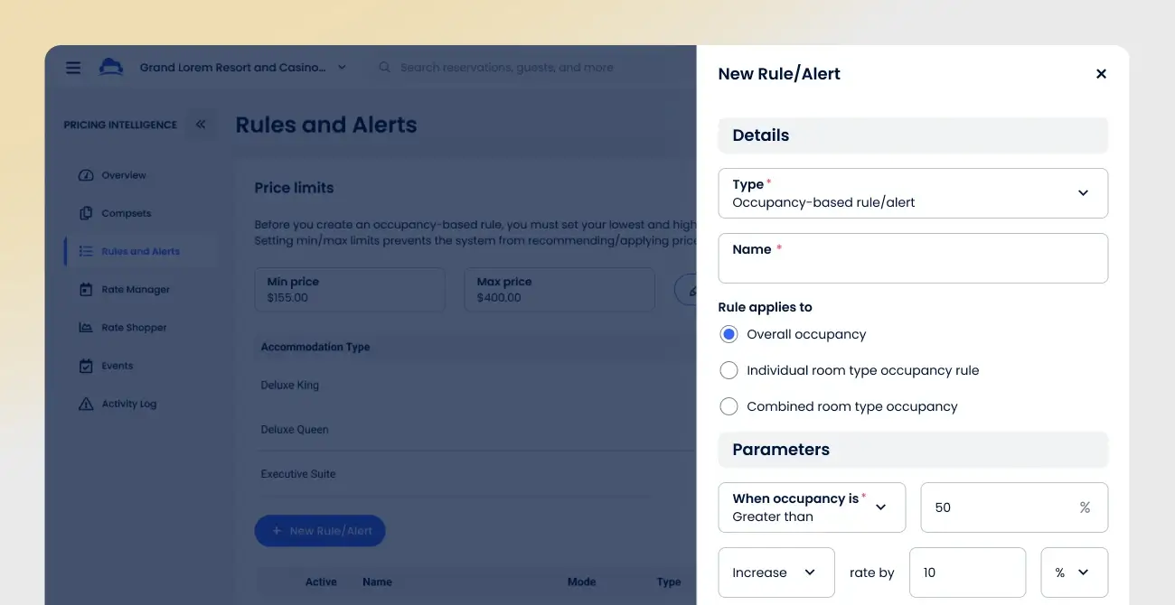 - Precios inteligentes. Los motores de reservas integrados con un motor de inteligencia de precios o un sistema de revenue management pueden ayudarte a fijar los precios de forma más estratégica, ajustando los planes de tarifas y los tipos de habitaciones en función de la demanda, la estacionalidad y otros factores.