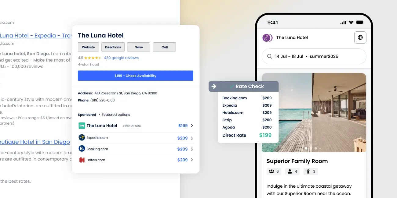- Integraciones de metabúsqueda. Los viajeros utilizan sitios de metabúsqueda como Trivago y Google para comparar precios y reservar. Integrarse con estos motores y ofrecer precios y disponibilidad en tiempo real garantiza que los huéspedes reserven directamente en lugar de con una OTA.