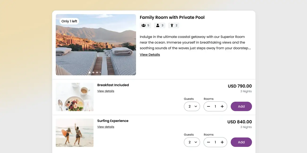 - Servicios adicionales y complementos. Los viajeros adoran las experiencias. Tu motor de reservas puede presentar a los huéspedes una serie de actividades y experiencias, tanto internas como con negocios colaboradores, que pueden mejorar su estancia y aumentar tus ingresos totales. Piensa en mejoras de categoría de habitación, alquiler de bicicletas, visitas guiadas o catas de vino, todo ello disponible en el momento de la reserva.