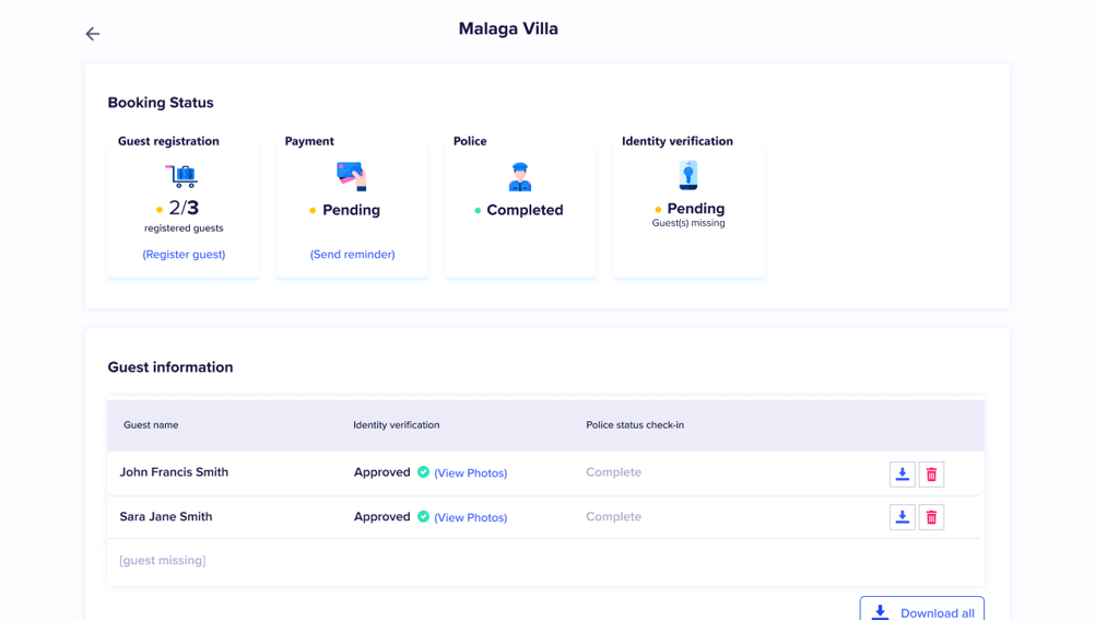 • Al conectar Chekin con tu PMS, todas tus propiedades y reservas se importarán automáticamente. Solo necesitarás agregar la identificación de las autoridades si necesitas enviar datos de los huéspedes a la policía o informes estadísticos. Cualquier actualización o eliminación de una propiedad se reflejará instantáneamente en Chekin.