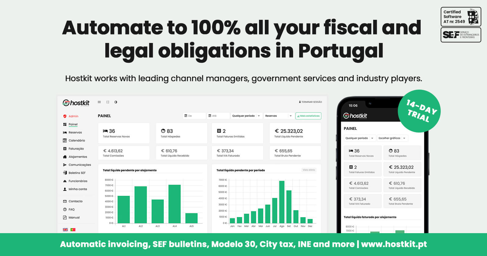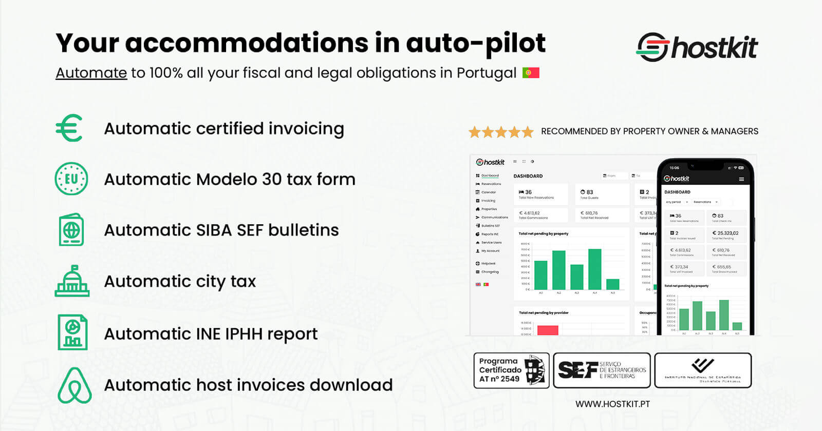 Hostkit se ha aliado con Cloudbeds para solucionar los problemas, la burocracia y los obstáculos de las obligaciones tributarias y legales a las que están sujetos los dueños, administradores, agencias y brókers de alquileres por temporada y desarrollos turísticos en Portugal. Incluyendo facturación certificada y automática de Cloudbeds.