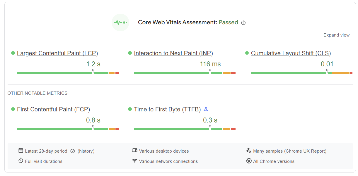 While AI engines don’t directly experience your website’s UX, poor performance can still harm your visibility. Why? Because tools like ChatGPT often rely on or are influenced by underlying search signals, including Google’s Core Web Vitals, which measure how fast, stable, and usable your site is.