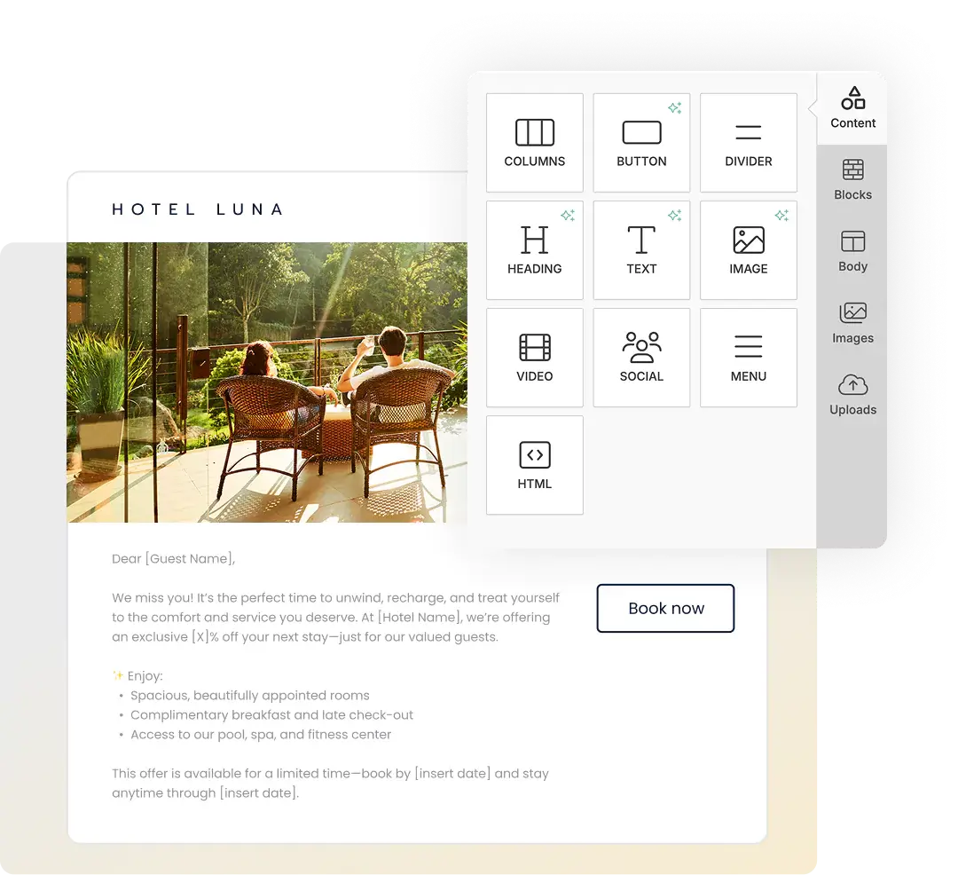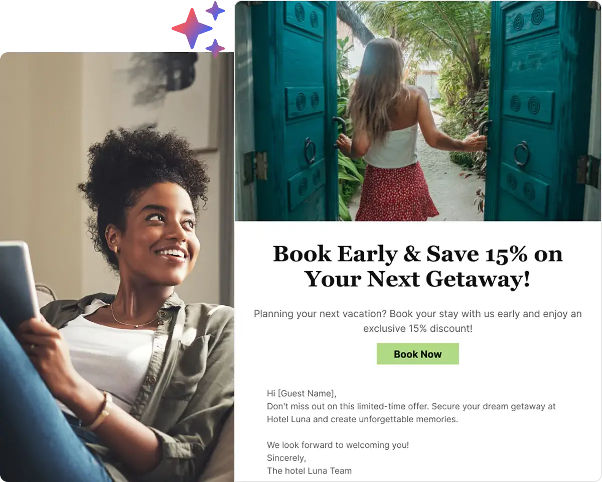 Your brand is more than a bed for the night. Create campaigns that drive direct repeat bookings, introduce guests to sister properties, and build a community that keeps coming back.
