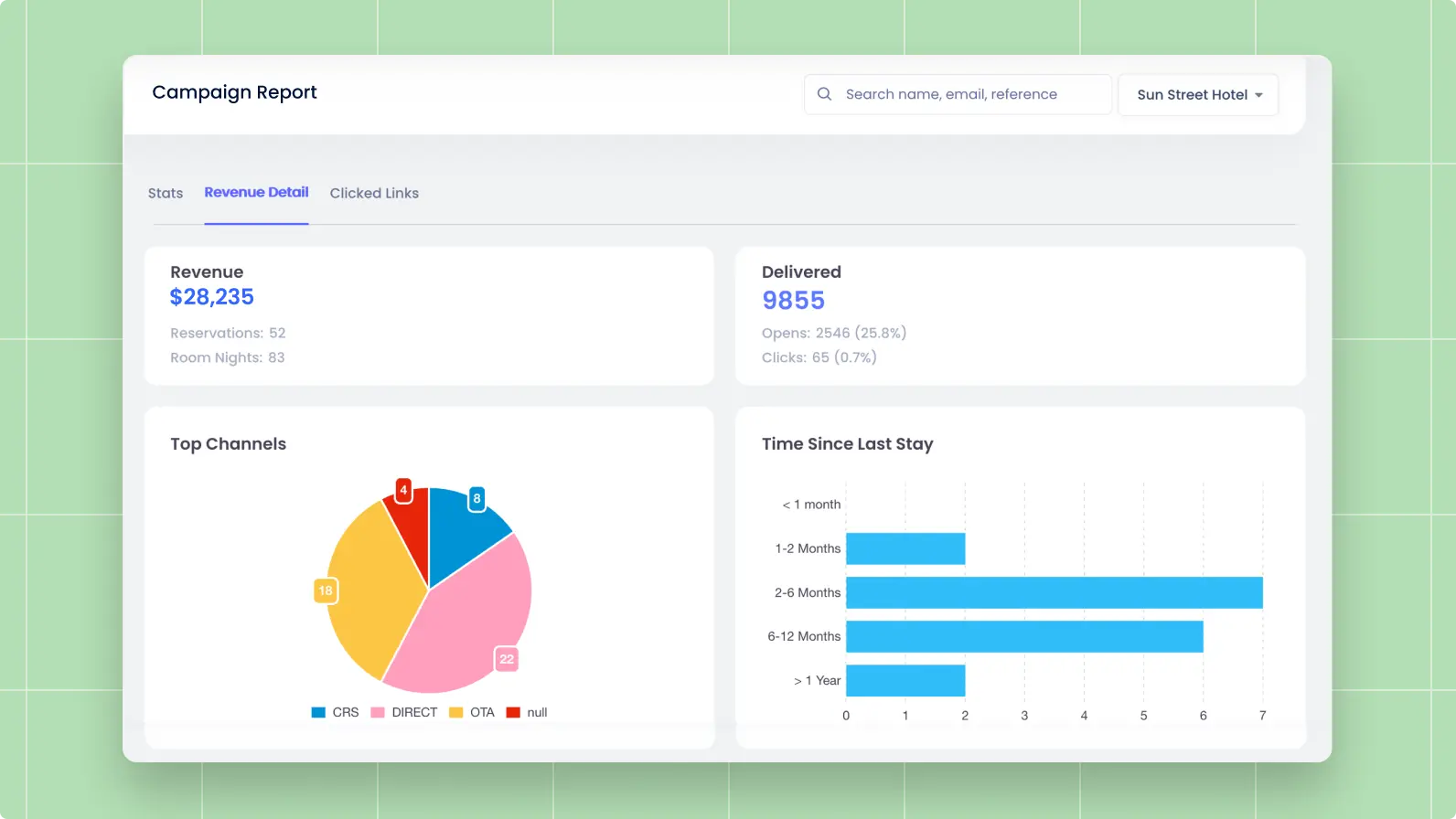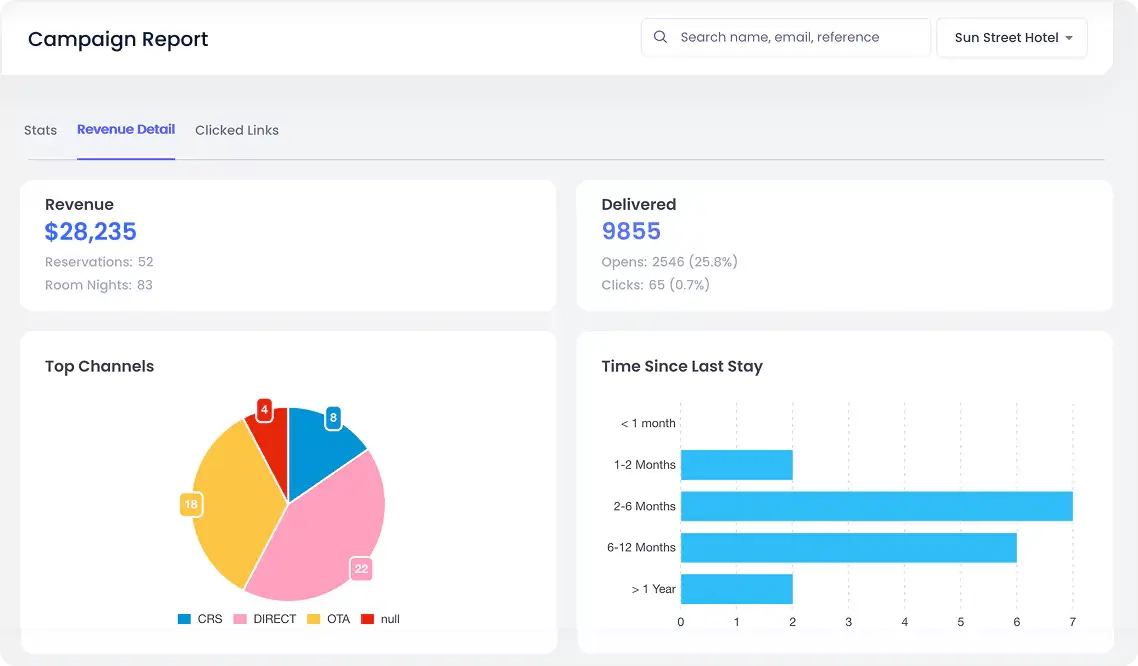 • Email KPI Overview: See opens, clicks, bookings, and associated revenue.