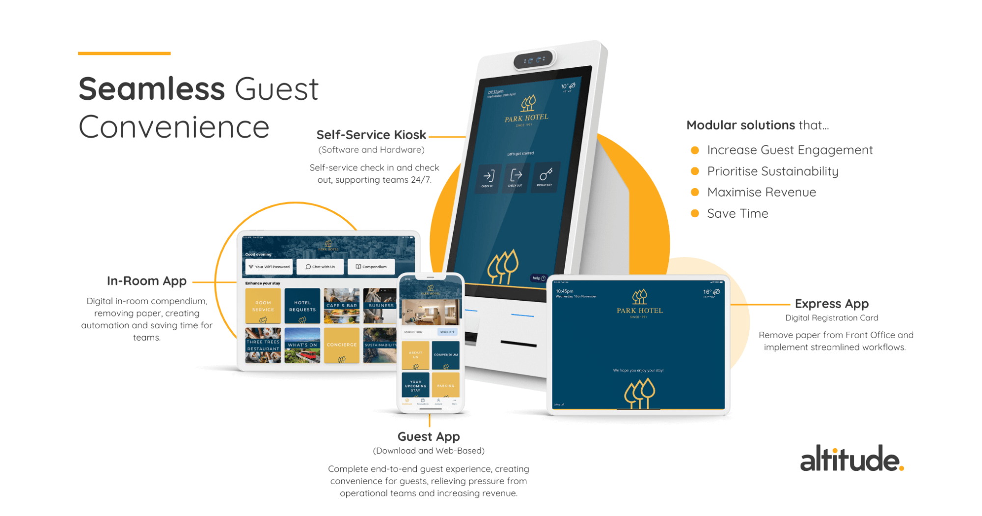 Create seamless guest experiences with Altitude’s modular platform, featuring white-label solutions such as the Guest App, Self-Service Kiosk, In-Room App and Digital Registration Card.