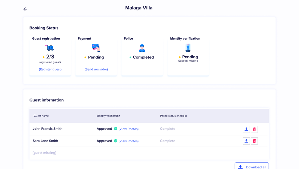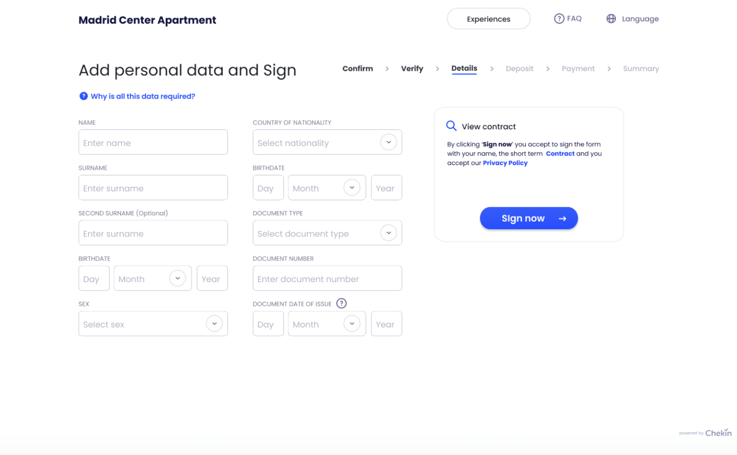 • Chekin safeguards your property against potential damages, fraud, or identity theft. Be assured by your guests and avoid fines for non-compliance with legal requirements.