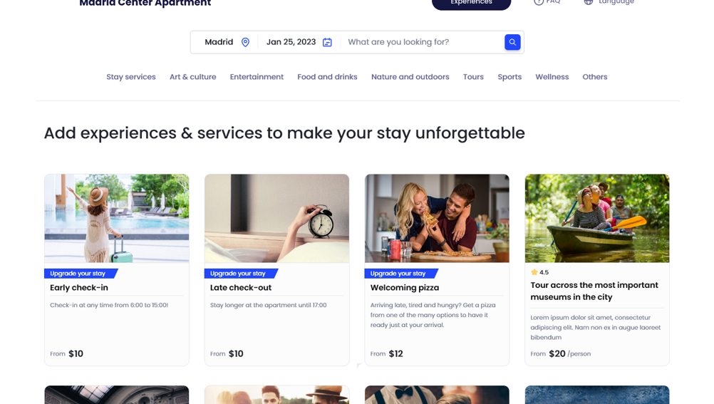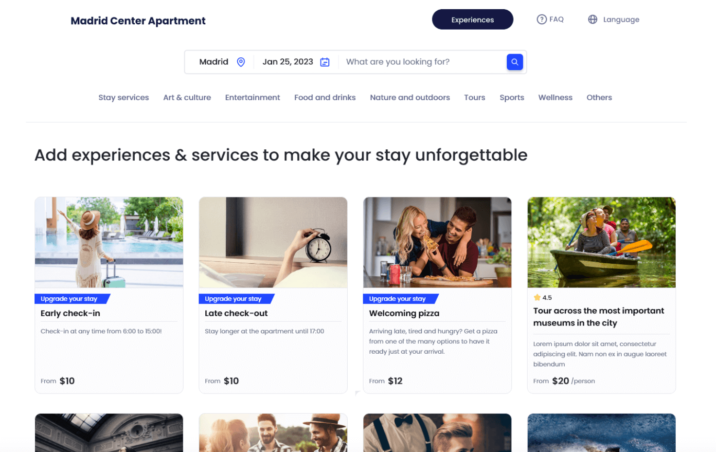 • Boost your income by offering customizable experiences for guests. Our clients have seen a 35% income increase. Most frequently sold services include pet-friendly options, late check-out, early check-in, airport transportation, pool heating, and private parking.