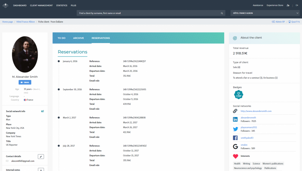 Experience CRM centralizes guest data to power customer relation campaigns, automated or one-off marketing, loyalty programs, and e-reputation management. The CRM includes a high level of business intelligence, for independent or hotel groups.