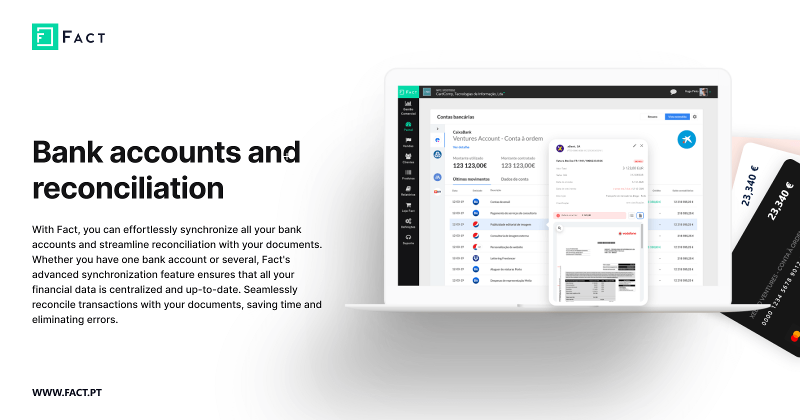 With built-in support for SAF-T, Fact is the leading solution in Portugal for business management software. Ideal for property owners seeking to streamline their invoicing, expenses, and bank accounts while also meeting monthly/annual government reporting requirements.
