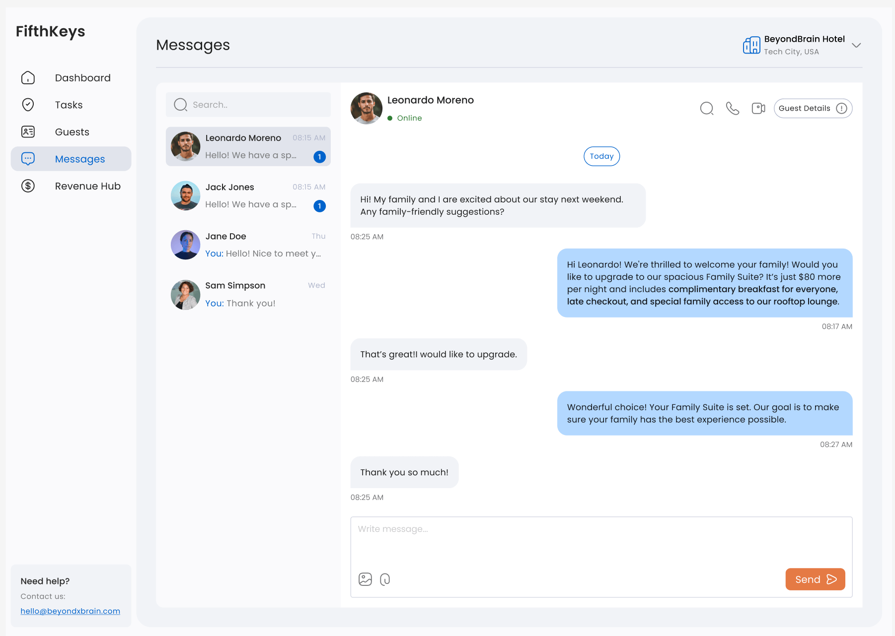 FifthKeys is the only AI solution that simultaneously solves the hospitality industry’s two biggest challenges—staffing shortages and revenue maximization. Our emotion-aware AI engine deeply analyzes guest preferences, automatically suggesting optimal offers at the most effective moments, while our 24/7 multilingual AI concierge dramatically reduces staff workload. Seamless Cloudbeds integration.