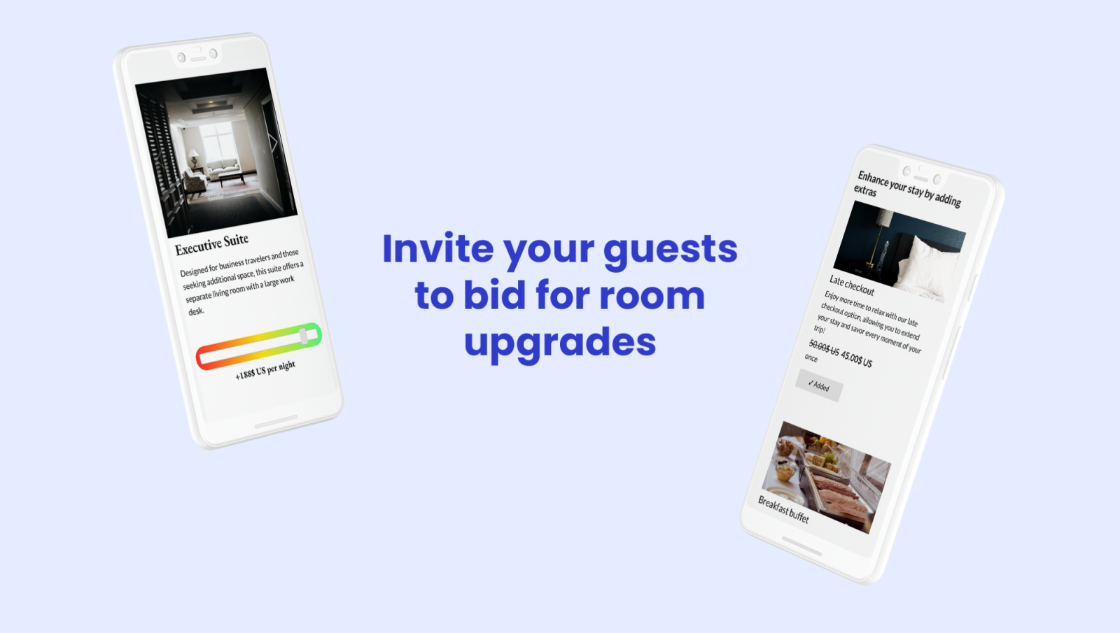 Upselling solution where guests can bid on rooms upgrades and purchase products