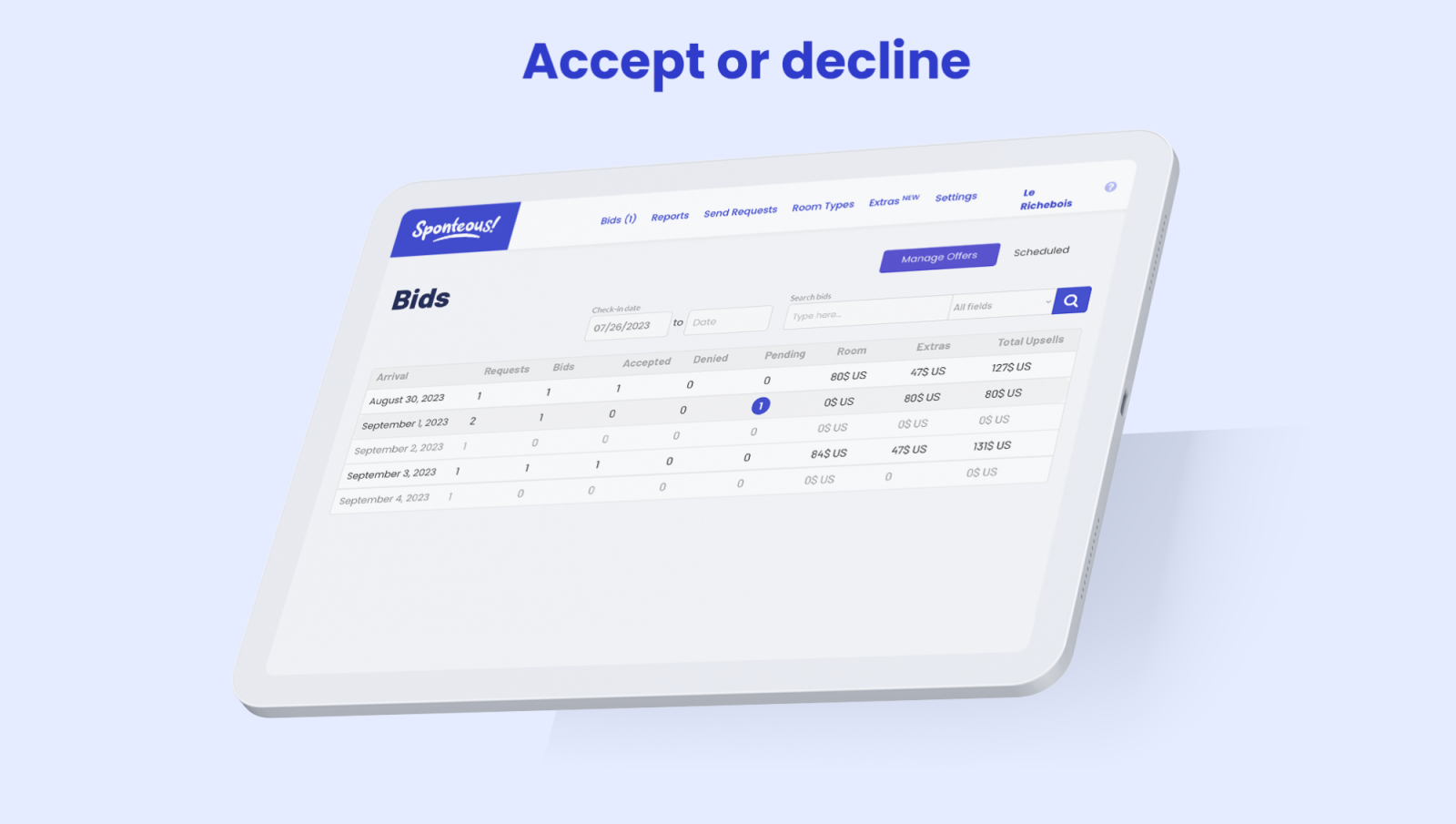 Sponteous is a pre-arrival upselling solution for hoteliers. It allows your guests to bid on your premium empty rooms or enhance their stay with your products. Plus, it’s fully automated.