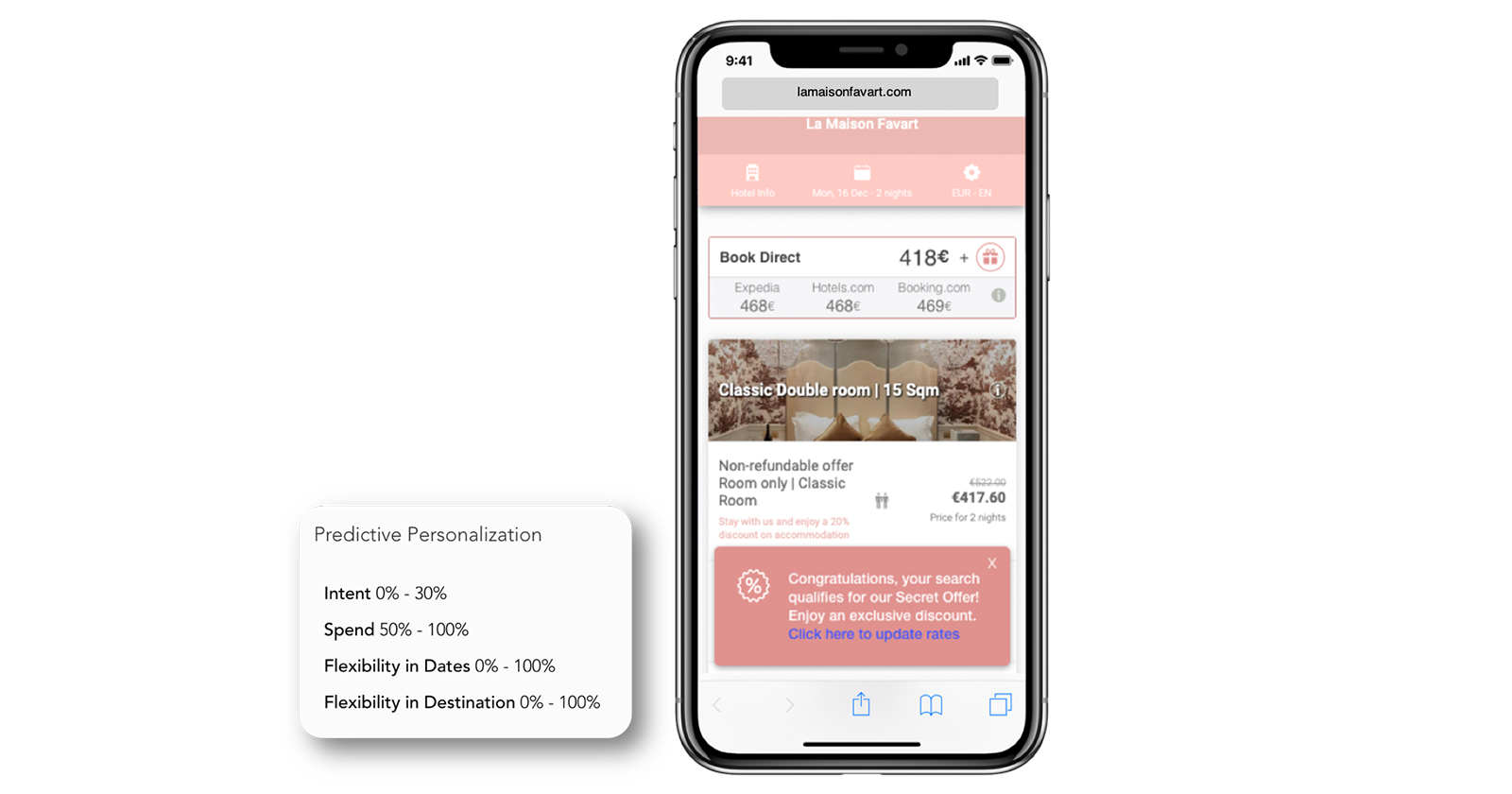 Imagine your website with an extensive set of targeting options to display content dynamically based on your guest’s profile – whether they’re making a last-minute booking from Paris or coming from TripAdvisor. By leveraging a series of integrated tools and analytics, AI and predictive personalisation, you can easily convert lookers into bookers.