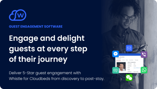 Whistle for Cloudbeds is the all-in-one guest engagement tool built explicitly for lodging businesses. As the #1 platform for guest engagement in hospitality, we help properties deliver a best-in-class guest experience while also increasing revenue.
