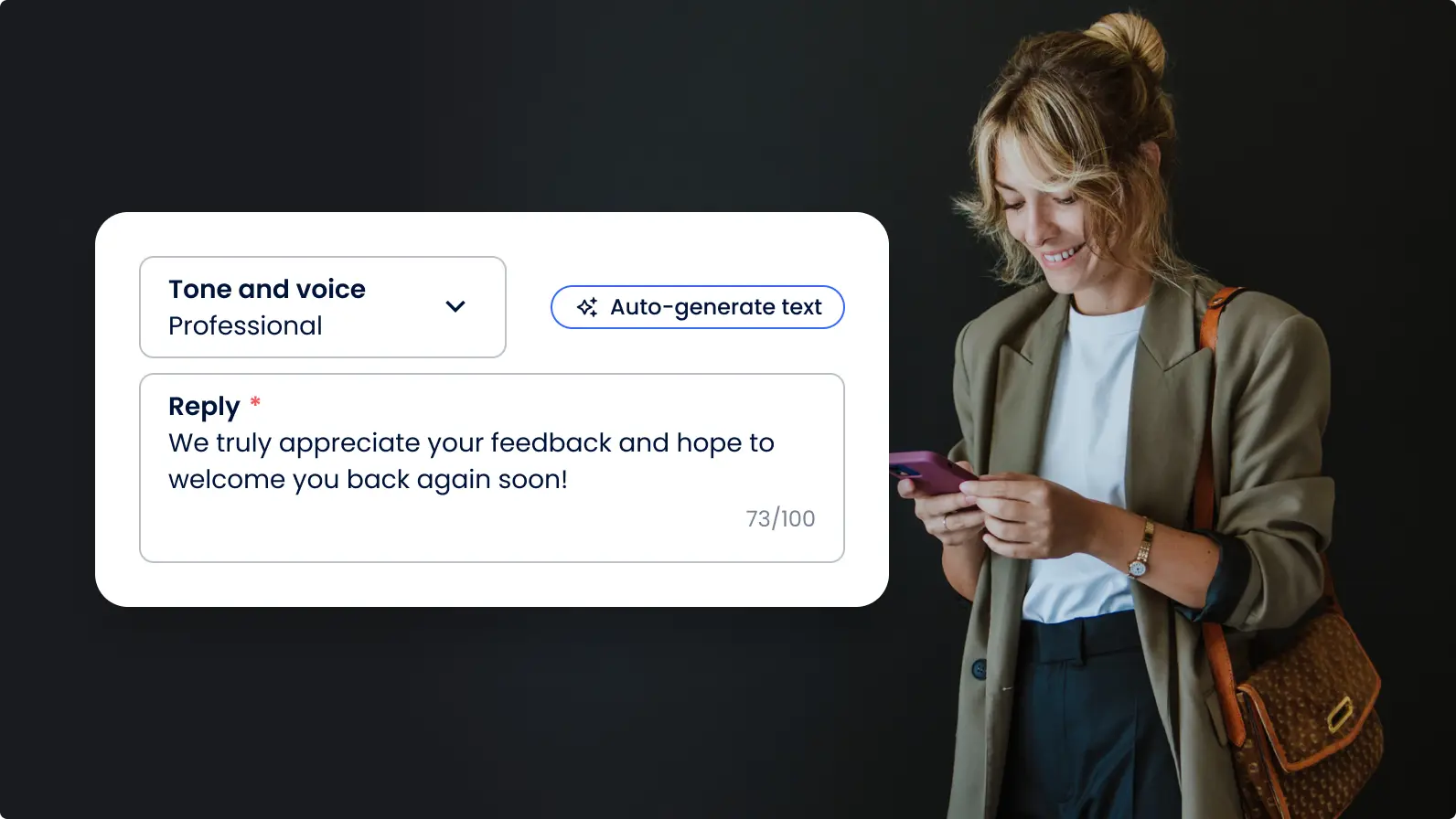 Edit or approve any auto-generated text based on your required tone, voice, and preferred language β€” before posting.