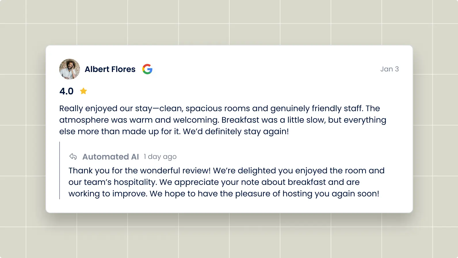 Since switching to Cloudbeds, we’ve been able to drive more reviews on Google, boosting our credibility with potential guests. In just three months, we received 50 new guest reviews on Googleβ€”a 17% increase from before!