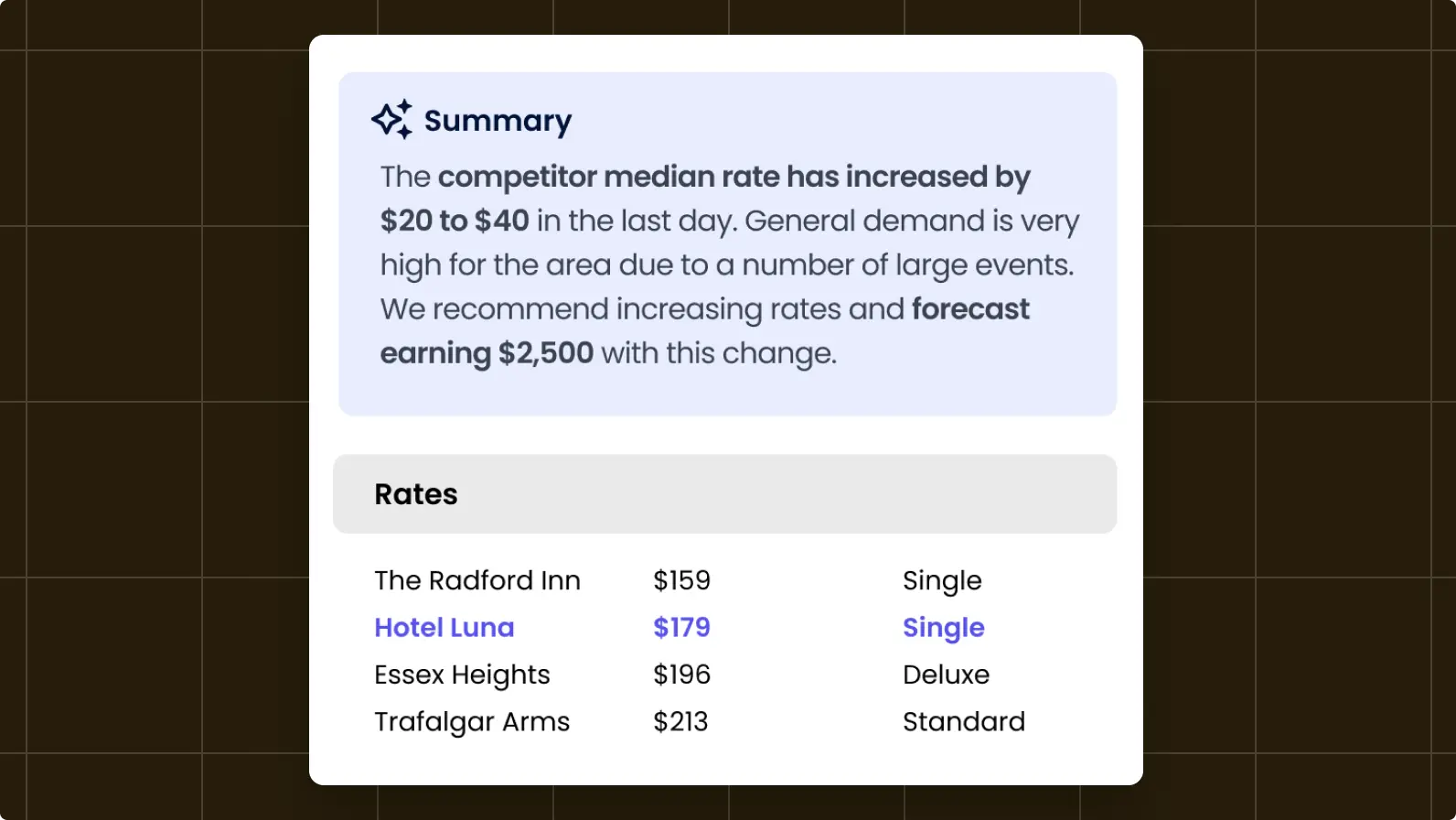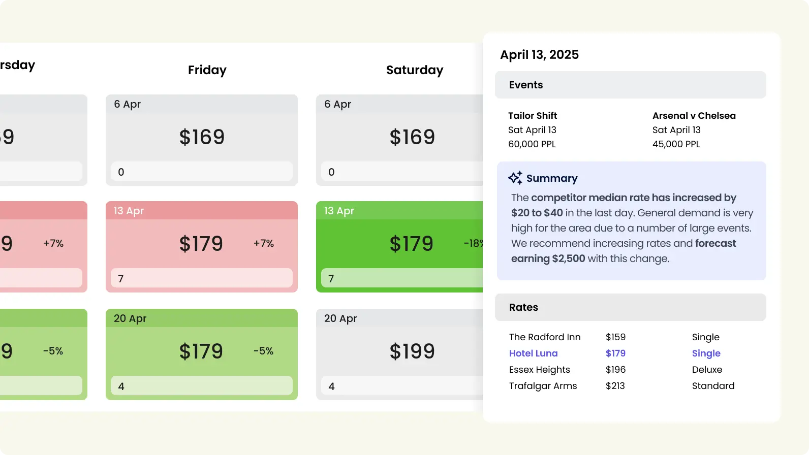 Each rate or campaign suggestion comes with a plain-language explanation (β€œEvent in city center expected to spike demand by 15 %”). Teams understand why and are more likely to adopt the change.